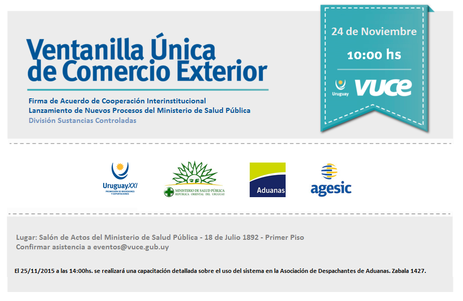 El evento se llevará a cabo en la Sala de Actos del Ministerio de Salud Pública con la participación del Sr. Ministro de Salud Pública Dr. Jorge Basso, Ing. José Clastornik Director de la Agencia de Gobierno Electrónico (AGESIC), Cr. Enrique Canon Director de la Dirección Nacional de Aduanas y Dr. Antonio Carámbula Director de Uruguay XXI (VUCE).