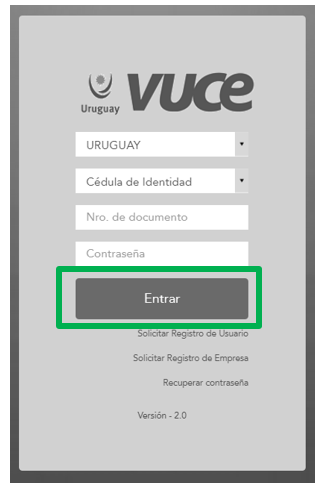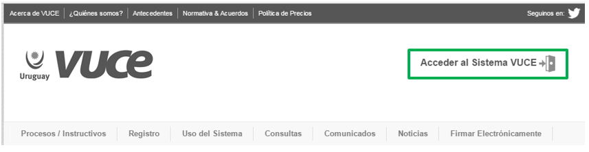 Debes ingresar a nuestra página institucional vuce.uy. En el extremo superior derecho (recuadro verde) encontrarás el enlace para acceder al sistema.