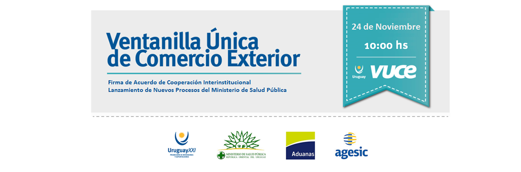 El 24/11/2015 se realizará lanzamiento del Acuerdo Específico de Cooperación Técnica para el desarrollo de la Ventanilla Única de Comercio Exterior entre el Ministerio de Salud Pública, la Dirección Nacional de Aduanas, la Agencia de Gobierno Electrónico (AGESIC) y Uruguay XXI.