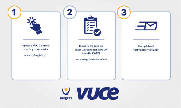 Se encuentra disponible en VUCE la tramitación de Exportación y Tránsito de cannabis al amparo de los Decretos 214/020 y 215/020 ante la Dirección General de Servicios Agrícolas, del Ministerio de Ganadería, Agricultura y Pesca y la División Sustancias Controladas del Ministerio de Salud Pública.