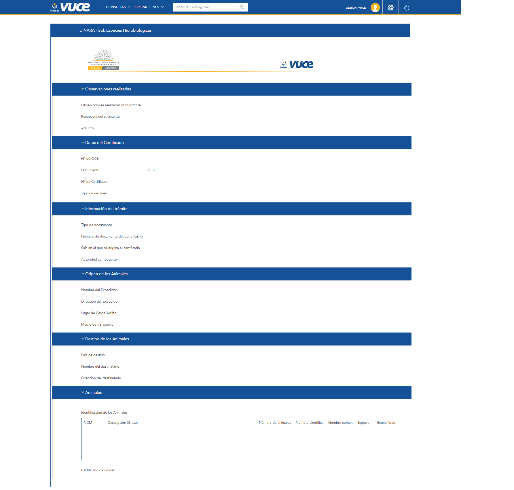 - PECE: CERTIFICADO VUCE – DINARA PARA EL CONTROL DE LAS IMPORTACIONES, EXPORTACIONES Y TRANSITO DE ESPECIES HIDROBIOLOGICAS VIVAS.- LEY 19.175 – LEY 13.833 RG 62/2016.- MNNT 1118