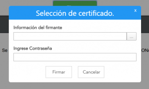 Deberás hacer clic en el botón “Firmar” e ingresar la clave de tu firma electrónica. Si tiene la firma en un archivo deberá primero seleccionar el archivo con extensión .pfx en el campo Información del firmante.