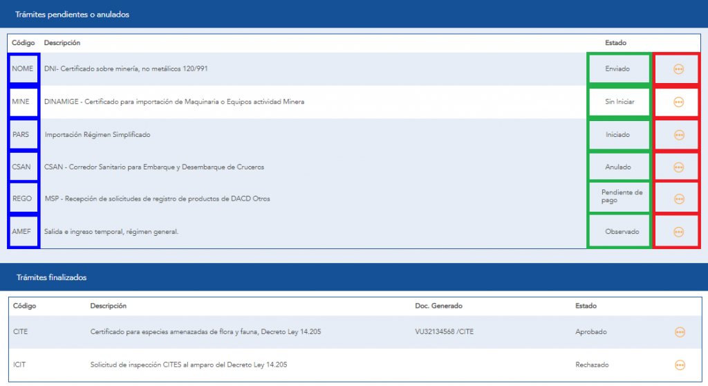 Podrá visualizar los trámites agrupados en dos secciones: Trámites por realizar y Trámites realizados. En cada trámite podrá visualizar el código del trámite (recuadro azul) y el estado del trámite (recuadro verde). Note que los estados pueden ser: